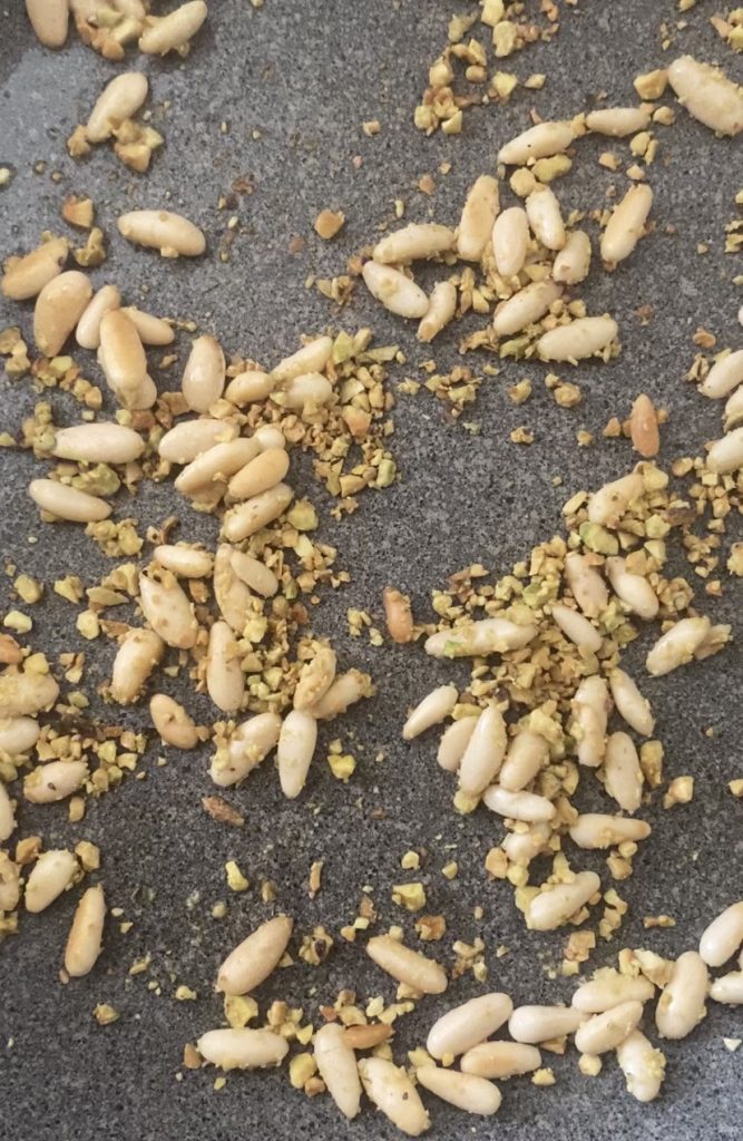 • Verhit in een koekenpan een scheutje olie, voeg de pijnboompitten toe en dan het pistachegranulaat.