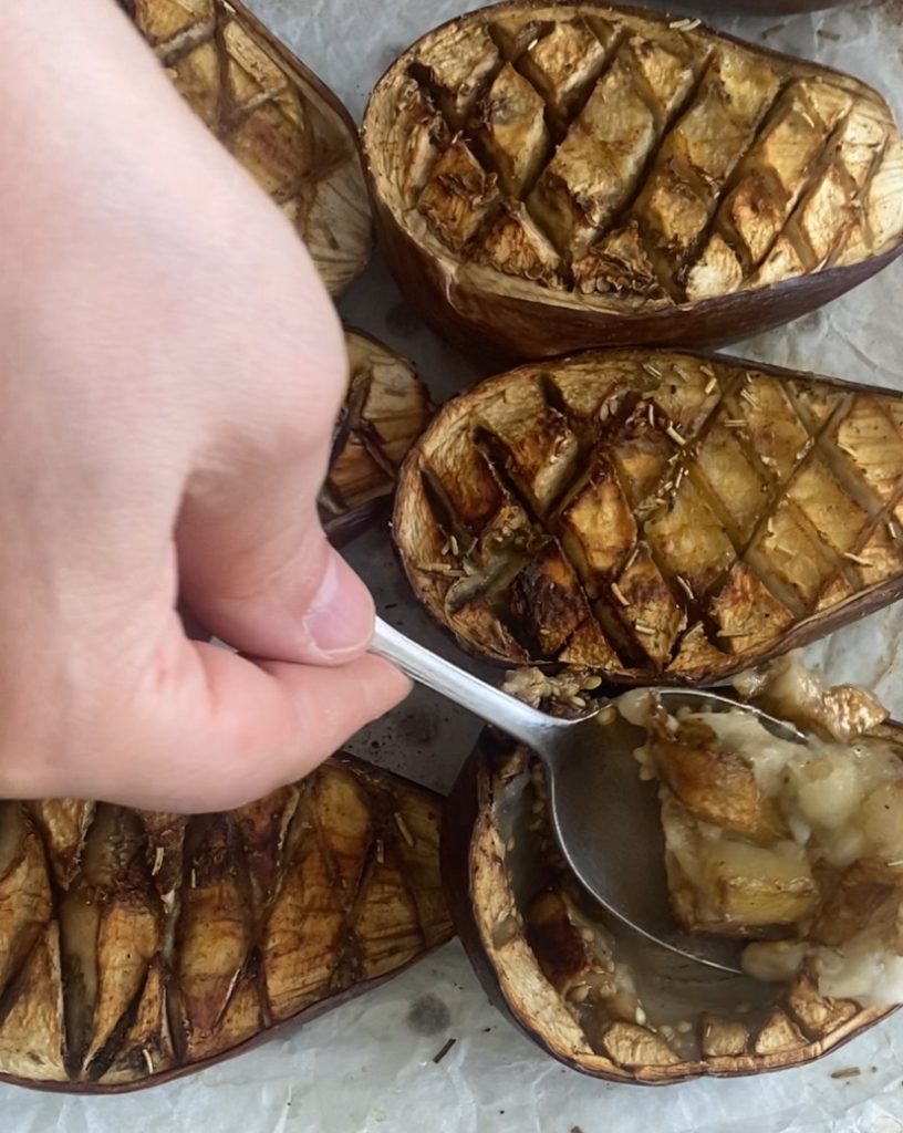• Was de aubergines goed en halveer ze in de lengte. Maak inkepingen zoals op de foto en breng op smaak met zout, kruiden en een scheutje olie.
