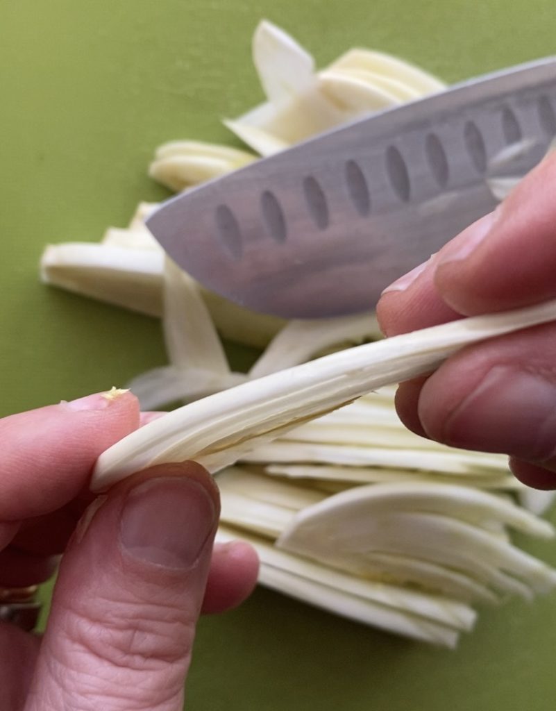 • Verwijder het buitenste deel van de ui, was hem en snijd hem dun.