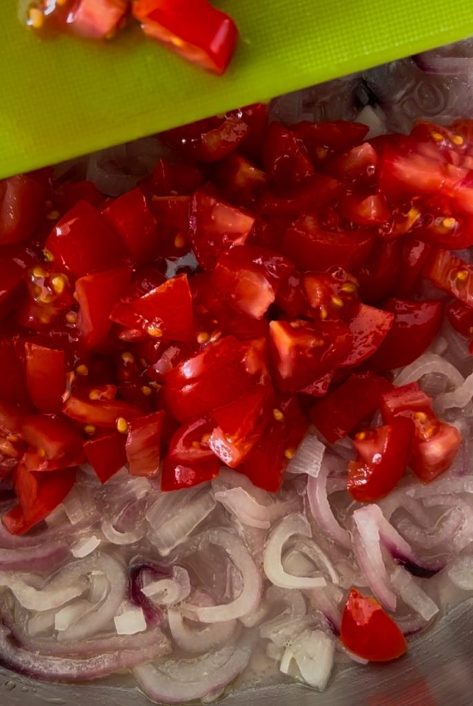 Terwijl de aubergines koken, hak je een rode ui van Tropea fijn en bak je deze in een pan met twee teentjes knoflook en een scheutje extra vergine olijfolie, totdat de ui zacht en doorschijnend wordt. Was en snijd de cherrytomaatjes in stukjes. Voeg ze toe aan het baksel, samen met een theelepel komijn, zoete paprika, zout en peper. Roer om de smaken te mengen en laat 15-20 minuten koken.