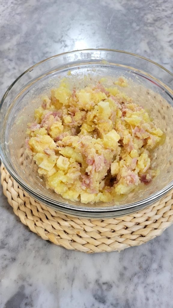 • Voeg ze toe aan de aardappelpuree en voeg het ei, zout, peper, een snufje nootmuskaat en de melk toe