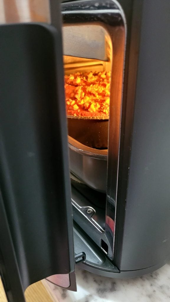 Na het bakken laat je de taart 5 minuten in de airfryer met de deur iets open