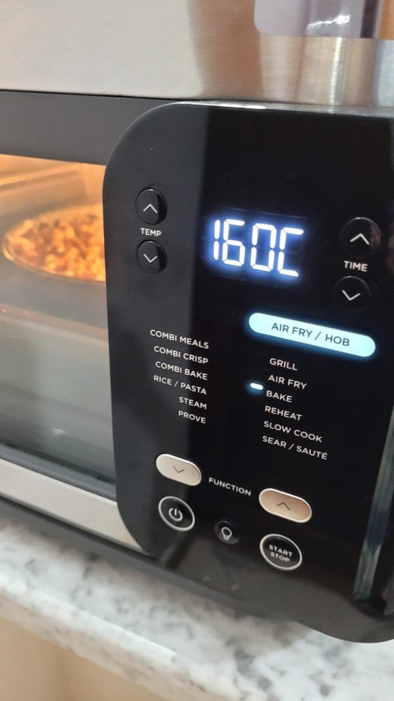 Plaats de vorm op het rooster en bak met het bake- of airfry-programma, op 160°C voor 40/45 minuten, test met een prikker niet eerder dan 30 minuten en op meerdere plekken. Hij moet volledig droog zijn
