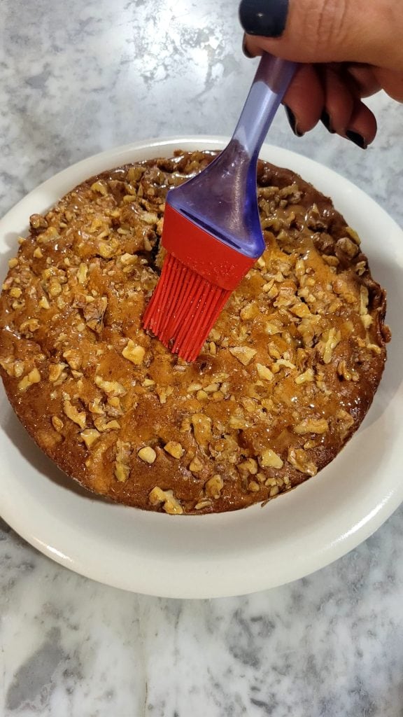 Als de taart koud is, haal je hem uit de vorm en leg je hem op een schaal, smeer de bovenkant in met honing. Om dit makkelijker te maken, smelt de honing au bain-marie of in de airfryer, giet de honing in een geschikte container. Ik koos voor de airfryer met een aluminium muffin bakvorm, 160°C voor iets meer dan een minuut.