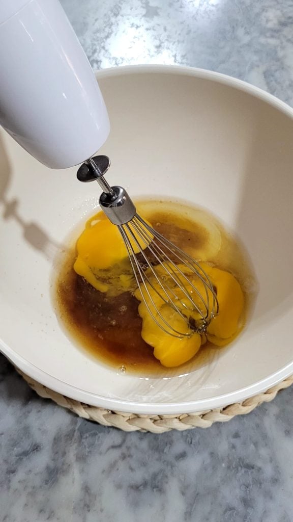 Klop in een andere schaal de eieren met de bruine suiker en het zout tot een luchtig en schuimig mengsel