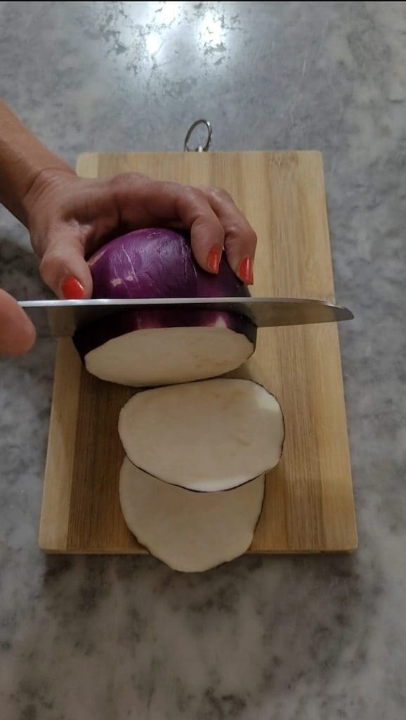 • Na het wassen en drogen van de aubergine, snijdt u de uiteinden af en snijdt u ze in plakjes van ongeveer 1 cm, 1 cm en 1/2 ongeveer