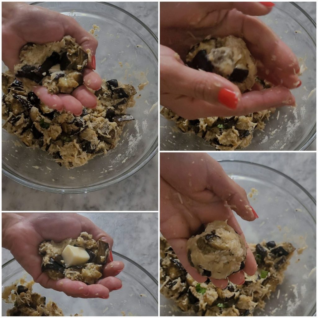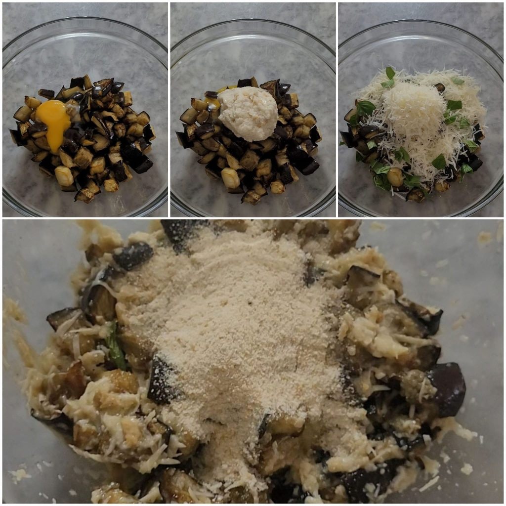 In een andere kom doe je de inmiddels gare aubergines, verwijder het teentje knoflook en laat ze even afkoelen, meng ze goed. Eenmaal afgekoeld kun je de rest van de ingrediënten toevoegen: het ei, de geraspte provolone, de in stukjes gescheurde basilicumblaadjes, een snufje zout (niet overdrijven, de provolone is al zout) en peper naar smaak. Voeg ook het goed uitgewrongen brood bij de overige ingrediënten. Meng goed, als het mengsel te zacht is, voeg dan 2 afgestreken eetlepels paneermeel toe