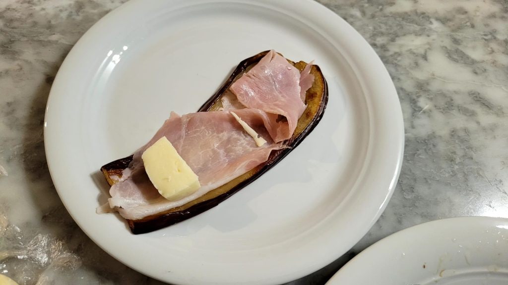 Om de auberginerolletjes alla parmigiana te bereiden, heb ik een gestreepte paarse aubergine gebruikt, die je kunt vervangen door een zwarte, datterinotomatenpuree, gekookte ham in plakjes en een zachte kaassoort, in plaats van mozzarella.