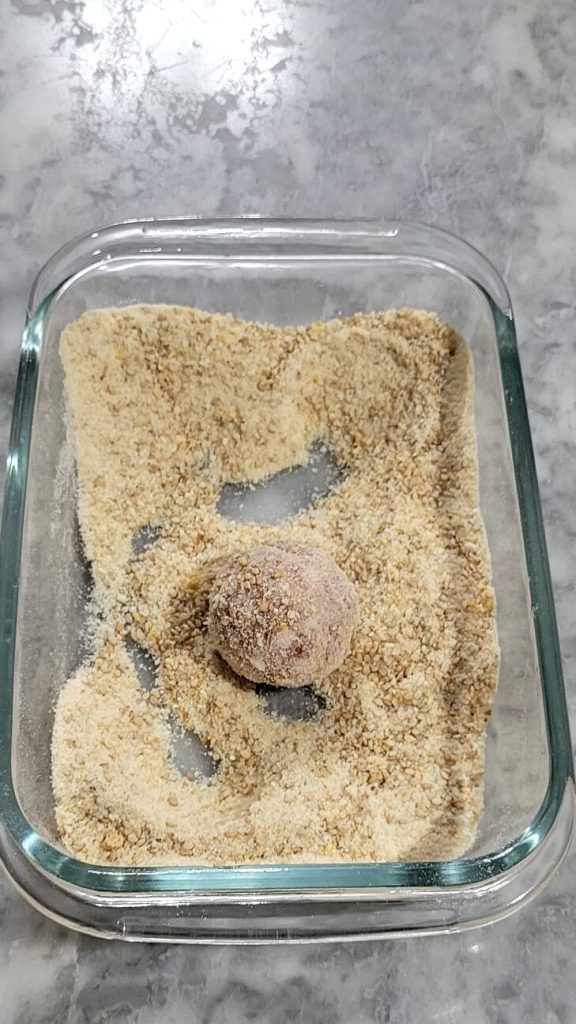 In een kleine ovenschaal of kom, giet het paneermeel, ik heb een paar sesamzaadjes toegevoegd en rol de balletjes erin zodat ze volledig bedekt zijn