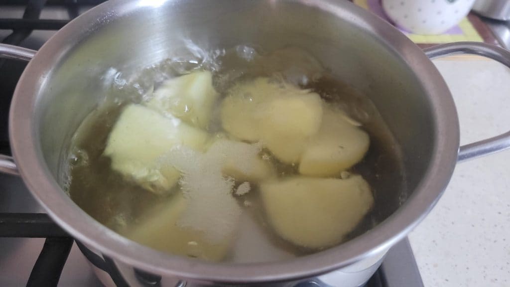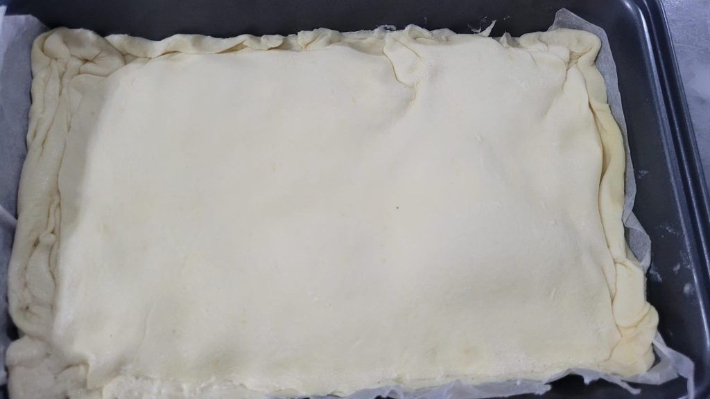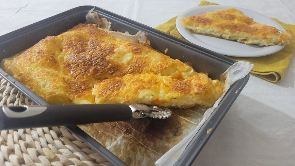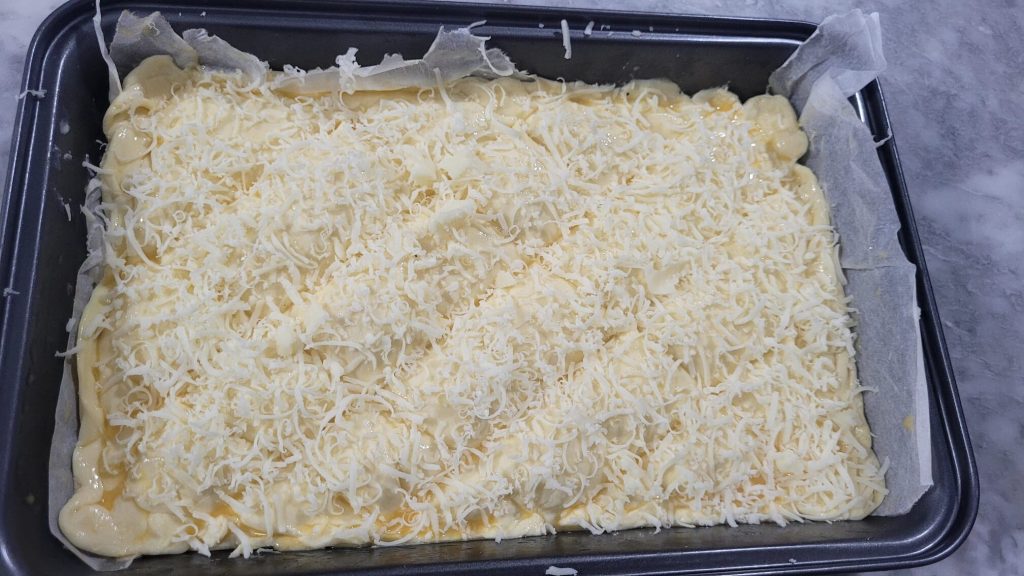 Voor dit recept heb ik een rechthoekig bladerdeeg gebruikt, dat ik doormidden heb gesneden en gevuld met een vulling van gemixte kaas, aardappelen en ei.