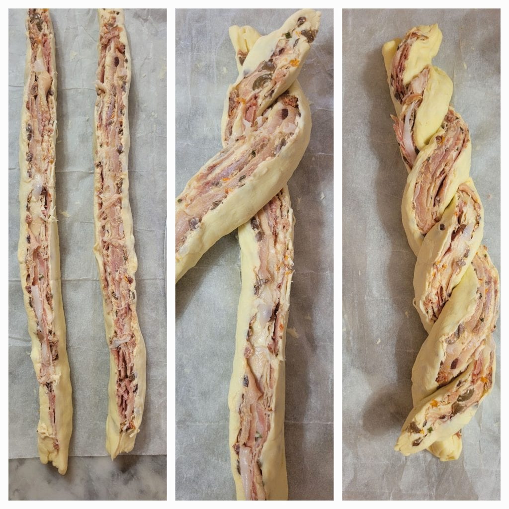 • Snijd de rol doormidden en draai de gesneden delen naar boven. Vlecht de twee rollen
