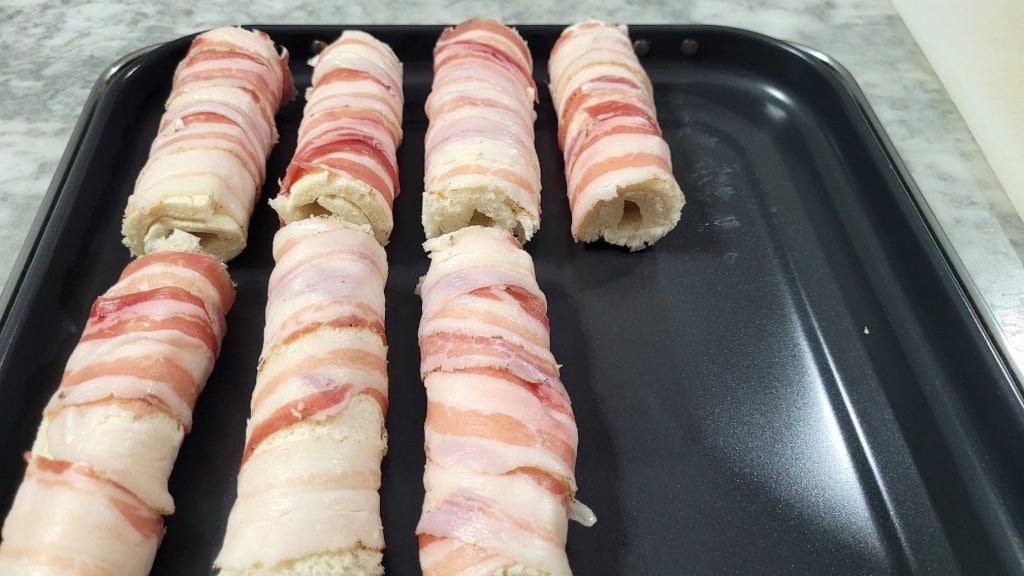 Neem de plakjes bacon en wikkel het rolletje volledig in; je hebt er 2 voor elke rol nodig, als ze erg smal zijn zelfs 3 om het volledig te bedekken