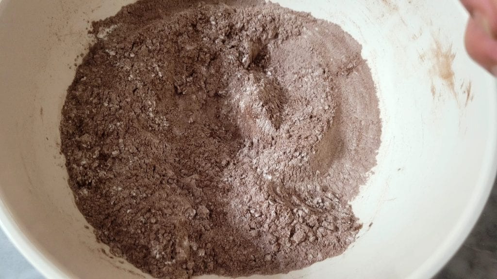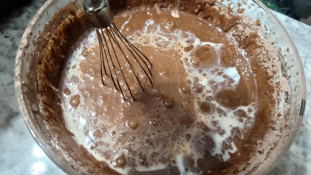 . Bereid in een kom de bloem, cacao en voeg een snufje zout toe. Vergeet niet het bakpoeder, altijd gezeefd, toe te voegen voordat je de bloem met de vloeistoffen mengt
