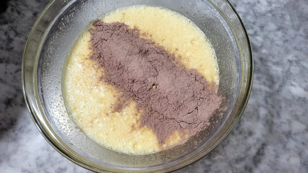 De Cacaokrans is zonder boter en het beslag is binnen enkele minuten klaar, de eieren en melk moeten op kamertemperatuur zijn, dus als je ze in de koelkast hebt, haal ze er dan minstens 30 minuten van tevoren uit… zullen we beginnen???