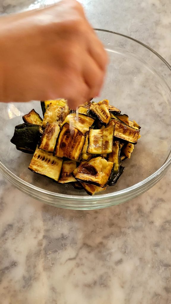 • Wacht een paar minuten tot ze afgekoeld zijn en snijd de courgetteplakken in 3 of 4 delen, afhankelijk van de lengte
