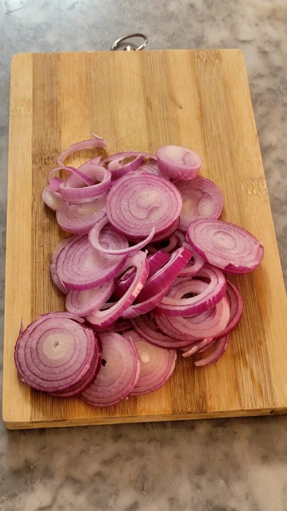 • Snijd eerst de twee uiteinden van de uien, schil ze en snijd ze in niet te dunne ringen
