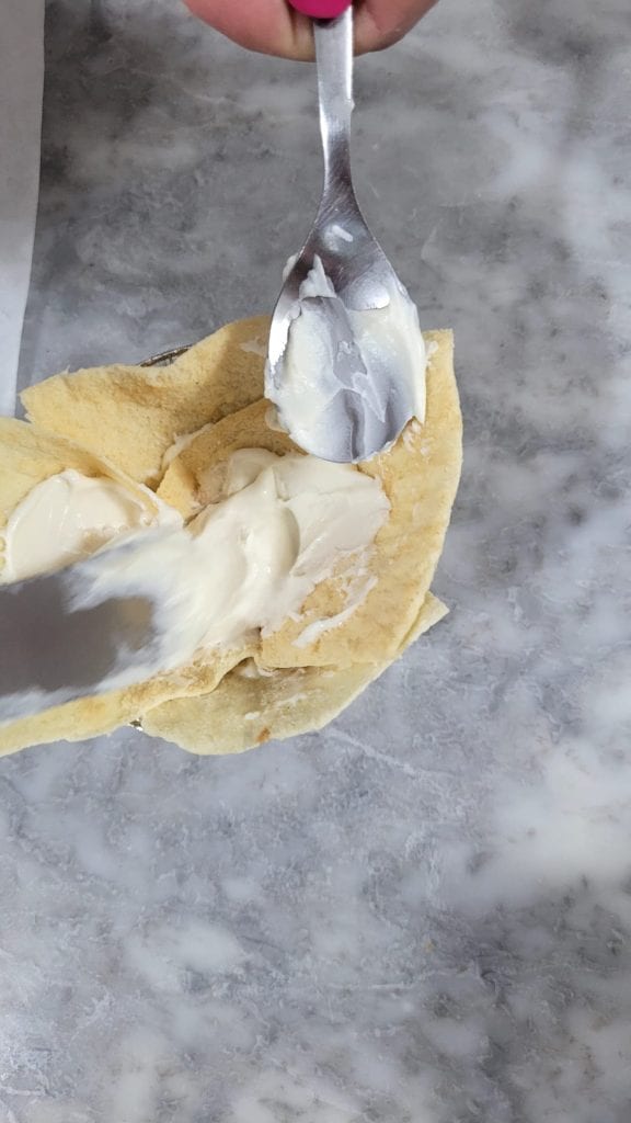 • Verdeel de repen doormidden en meet af op de grootte van het pane carasau vel. Smeer de pecorino in het midden van het brood