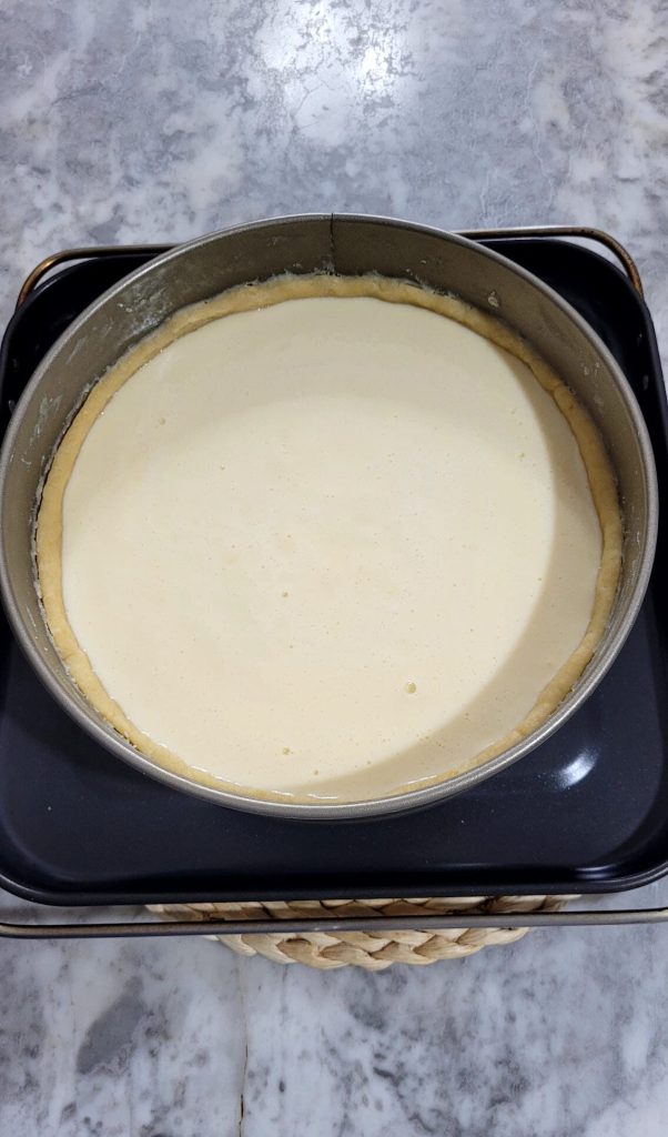 Als hij gaar is, haal hem uit de oven: de vulling zal licht wiebelen, vergelijkbaar met pudding, en dat is volkomen normaal — hij moet zo blijven om de juiste textuur te krijgen. Laat volledig op kamertemperatuur afkoelen voordat je hem serveert.