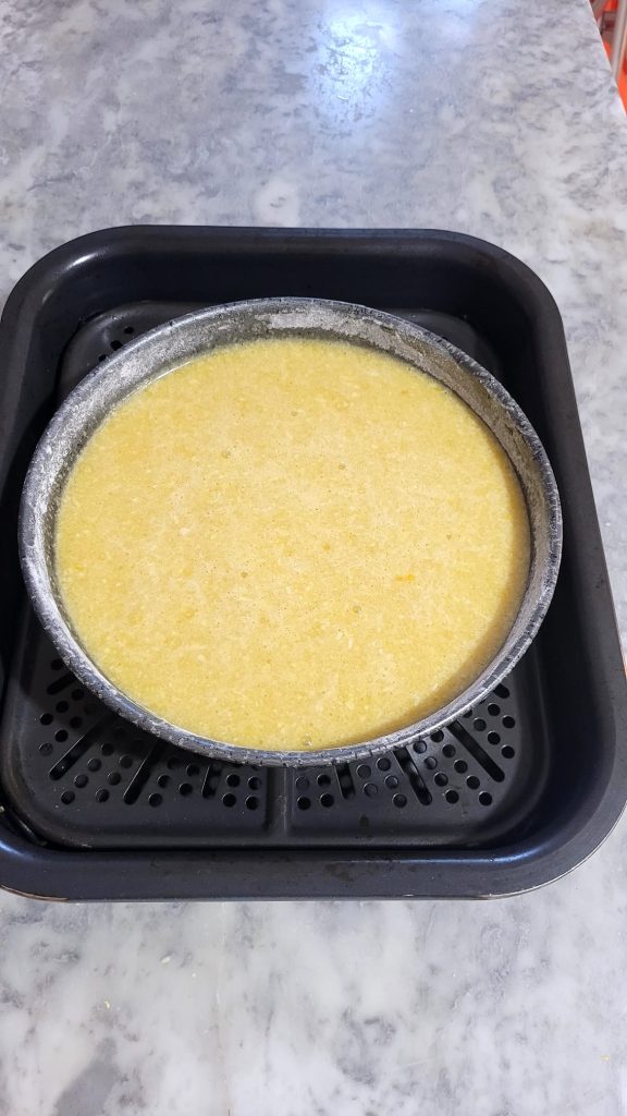 Giet het beslag nu in een ingevette en bebloemde bakvorm (ik gebruik olie en zetmeel). Verwarm ondertussen de airfryer voor op 160°C voor 2/3 minuten. Plaats de vorm op het rooster of de lade.