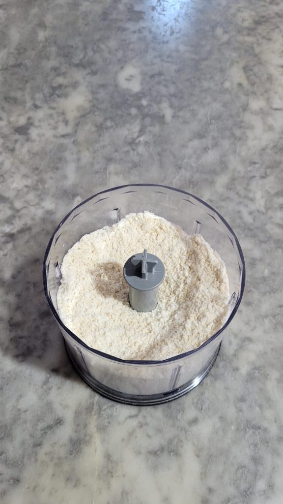 Doe de geschaalde amandelen en de poedersuiker in de blender.