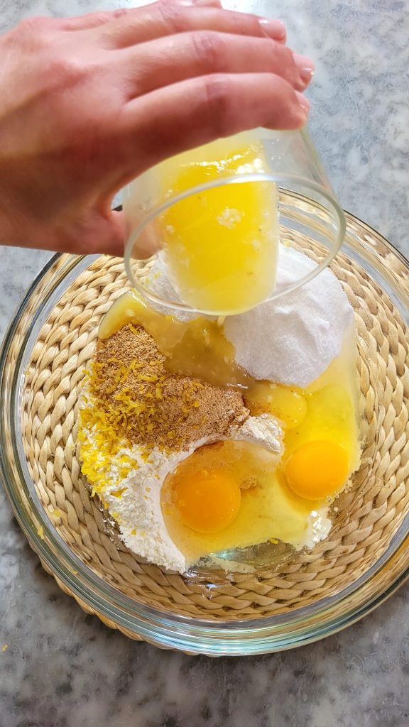 Doe in een kom de bloem, de fijngemalen amaretti of amandelmeel, de suiker, de geraspte citroenschil, 2 theelepels sinaasappelaroma, enkele druppels amandelaroma, de eieren, het bakpoeder, een snufje zout en tenslotte de gesmolten boter.