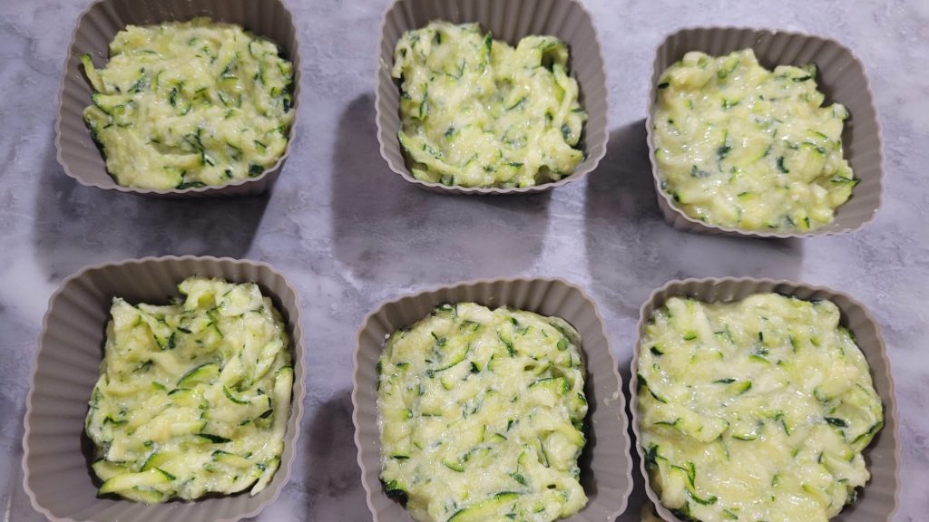 Courgettes zijn erg waterig, knijp ze zeer goed uit anders krijg je niet het gewenste resultaat. Siliconen bakvormpjes zijn erg handig maar ze houden de voedsel vochtig, daarom heb ik de temperatuur verlaagd en nog 10 minuten doorgekookt, de onderkant was nog een beetje licht. Bij gebruik van aluminium bakvormpjes kan het een paar minuten korter duren. Controleer tijdens het koken