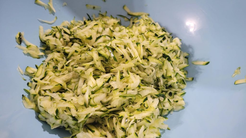 • Was eerst de courgettes, droog ze en verwijder de uiteinden. Rasp ze met een rasp met grove gaten