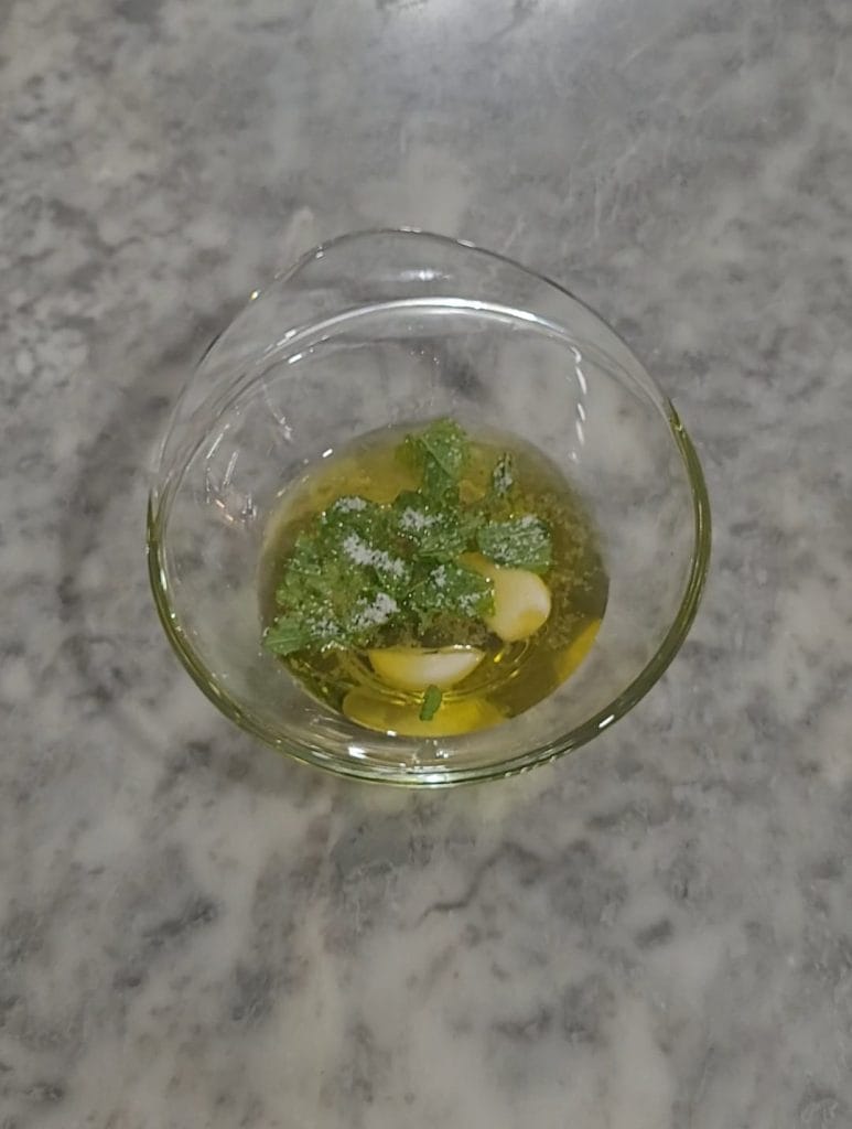 • Begin met het bereiden van de emulsie, hierdoor kunnen de smaken beginnen te marineren. Neem een kommetje, doe het doormidden gesneden teentje knoflook erin en voeg de olijfolie, azijn, gehakte muntblaadjes en een snufje zout toe. Meng goed en zet apart