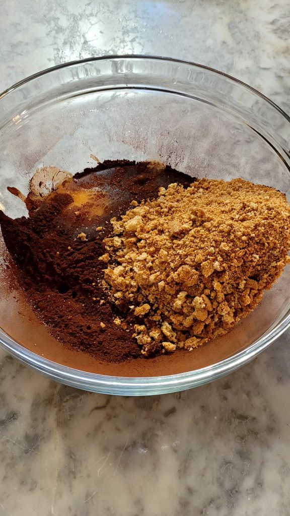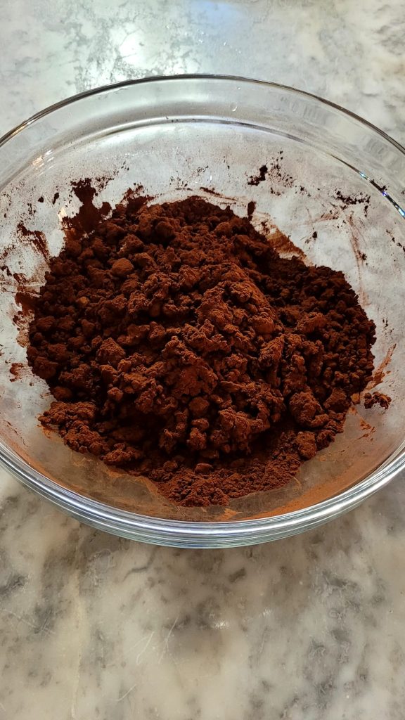 Doe in een andere kom de gezeefde cacao, een snufje zout, voeg het ei toe, verkruimel de amaretti grof met je handen