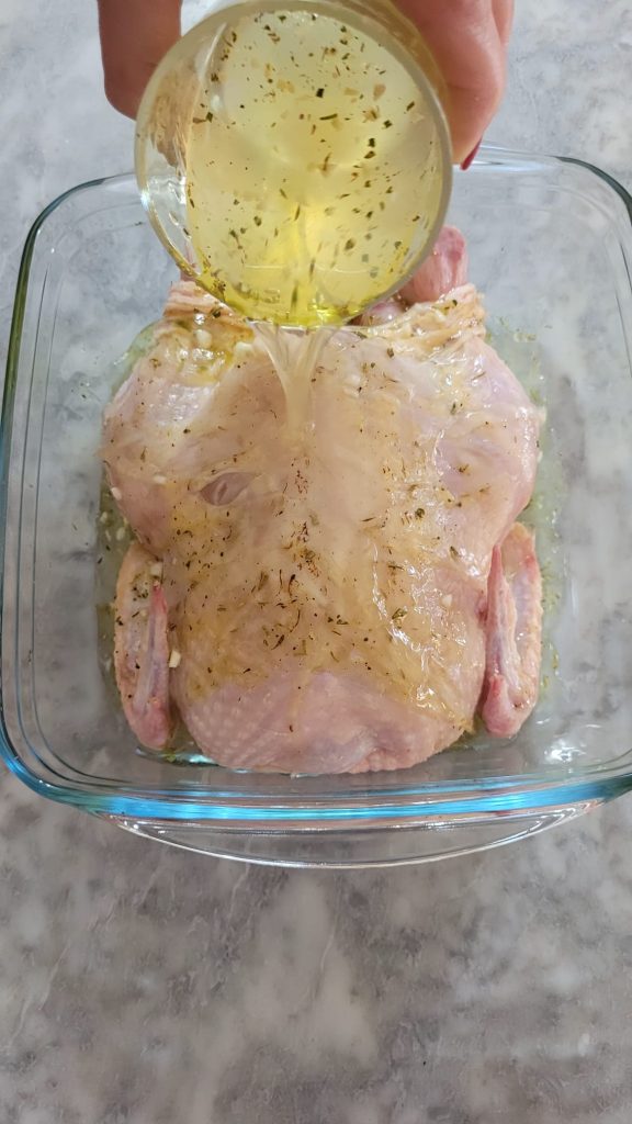 Als je een Airfryer met draaispit gebruikt, hoef je het alleen maar te besprenkelen: hij doet de rest. Voor dit recept van de Gebraden Kip in Airfryer maak ik twee identieke marinades: één voor de rusttijd in de koelkast van ongeveer 6 uur en één voor het koken, essentieel om besmetting te voorkomen. De smaken? Olie, wijn, azijn, zout, peper, rozemarijn, knoflook, citroen en laurier, maar je kunt ze aanpassen aan de smaak van je familie.