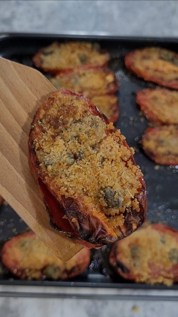 De combinatie van smaken en texturen maakt dit gerecht onmisbaar, licht en perfect voor elke gelegenheid. Voor het recept van de Gegratineerde Tomaten, gekookt in de Airfryer heb ik rijpe en stevige San Marzano-tomaten gebruikt, terwijl ik voor de gratin eenvoudige ingrediënten heb gebruikt die perfect samengaan met de smaak van de tomaat: paneermeel, grana padano, kappertjes, ansjovis, oregano, zout en peper. Je kunt de kruiden toevoegen of vervangen die je verkiest of die de hele familie tevredenstellen.