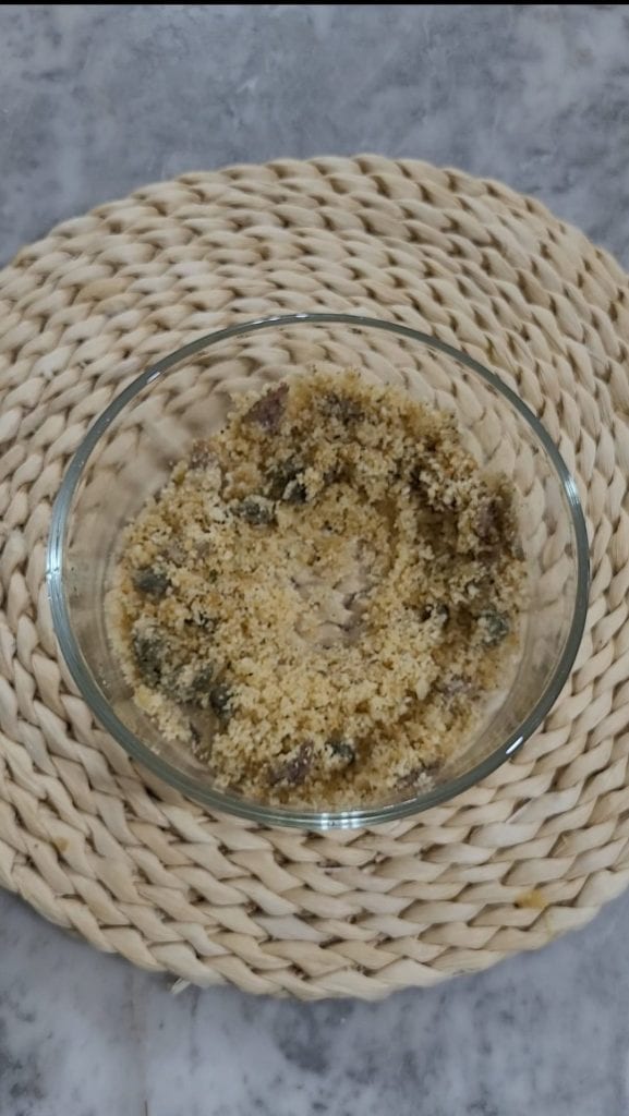 • Bereid ondertussen het mengsel voor de gratin voor. Eerst laat je de kappertjes 10 minuten ontzouten in een kommetje met koud water, spoel ze daarna goed af om alle zoutresten te verwijderen. Neem een kom en voeg alle ingrediënten samen: 2 eetlepels grana padano, 3 eetlepels paneermeel, de kappertjes, de fijngesneden ansjovis, 3 eetlepels olijfolie, een snufje zout, peper en oregano naar smaak. Meng goed met een lepel