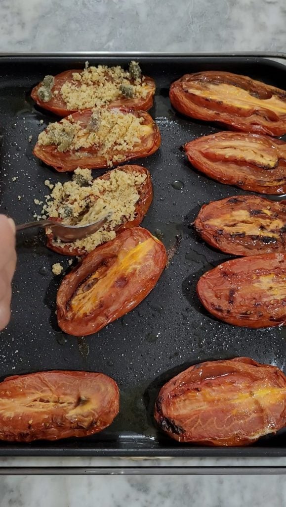 • Haal de bakplaat uit de airfryer na de eerste kooktijd en bedek de bovenkant van de tomaten met het paneermengsel.