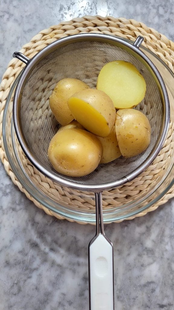 Ongeacht de gekozen kookmethode voor de aardappelen, doe de test met een tandenstoker, deze moet zonder weerstand kunnen doordringen, de aardappelen moeten gaar zijn, maar niet te zacht