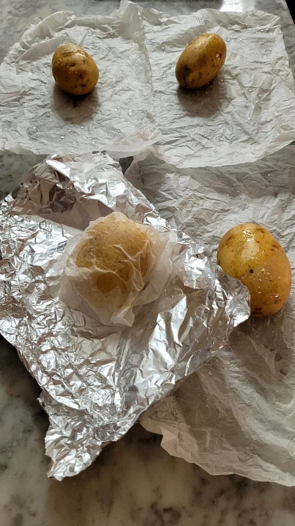 • Was de aardappelen grondig om eventuele aarde te verwijderen. Bevochtig en knijp 4 stukjes bakpapier uit. Plaats een aardappel op elk vel bakpapier, besprenkel ze met een scheutje extra vergine olijfolie en een snufje zout