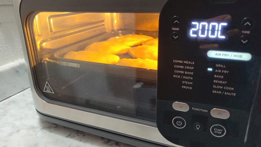 Plaats de bakplaat in de friteuse en start het programma op 200°C voor 8 minuten. Verlaag indien nodig naar 180°C en ga verder voor 4 minuten. Draai ze voor een betere kleuring om en ga door met koken voor nog eens 4 minuten.