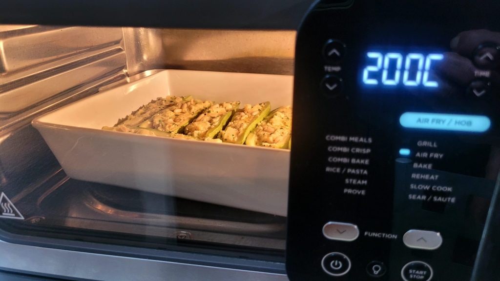 Ik heb ze in mijn Ninja Combi 12 in 1 gekookt, die naast een airfryer ook een multicooker met stoomfunctie is. Ik heb twee kopjes water in de bakplaat met het airfry-rooster gedaan, waarop ik de gesneden courgettes heb geplaatst.