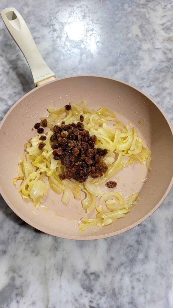 Doe de rozijnen in een glas of kopje met lauw water en laat ze 10 minuten weken zodat ze zacht worden. Schil en snijd ondertussen de ui in plakjes. Doe de ui in een pan met een scheutje extra vergine olijfolie en laat deze zachtjes goudbruin worden; voeg indien nodig een beetje water toe om het garen te bevorderen.