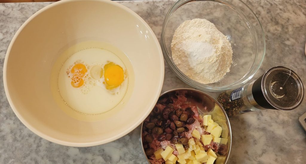 Begin met het voorbereiden van alle ingrediënten in een kom die je voor de vulling gaat gebruiken, kaas in blokjes, ham en salami in stukjes, olijven enz. Ik heb gekookte ham en salami in plakjes gebruikt, maar je kunt ook blokjes gebruiken.