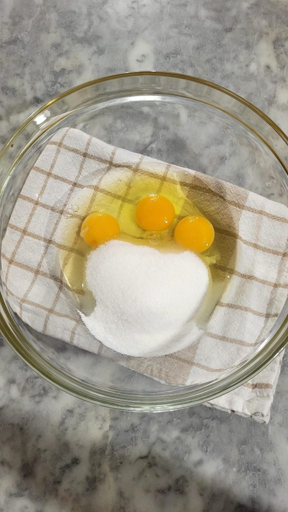 Klop in een kom met de elektrische garde de eieren met de suiker en een snufje zout tot een licht en schuimig mengsel
