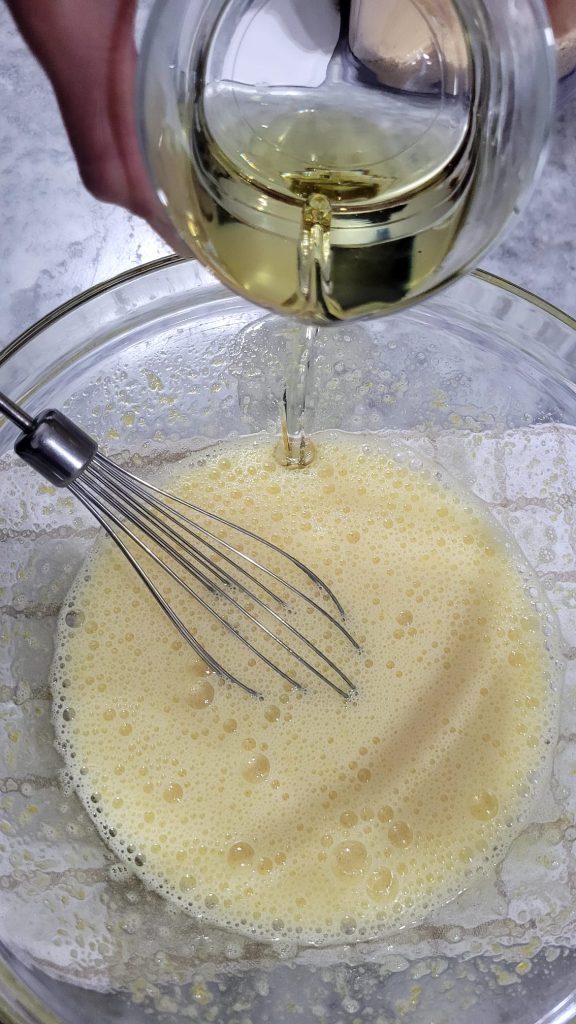 Voeg in een dunne straal de olie toe terwijl je op de hoogste snelheid klopt