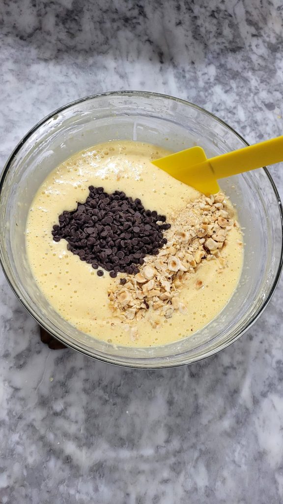 Voeg nu de grofgehakte hazelnoten en de chocolade druppels toe en spatel ze voorzichtig van onder naar boven door het beslag