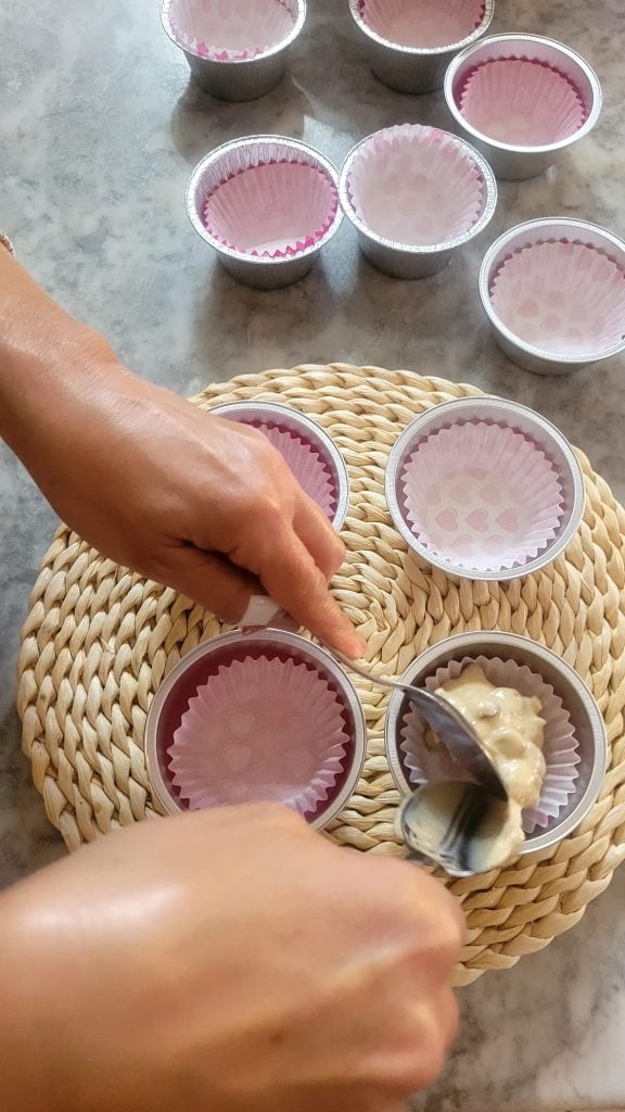 Gebruik 2 lepels om de papieren vormpjes te vullen, die je in de aluminium vormpjes hebt geplaatst