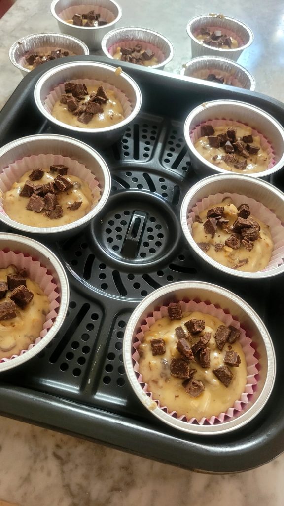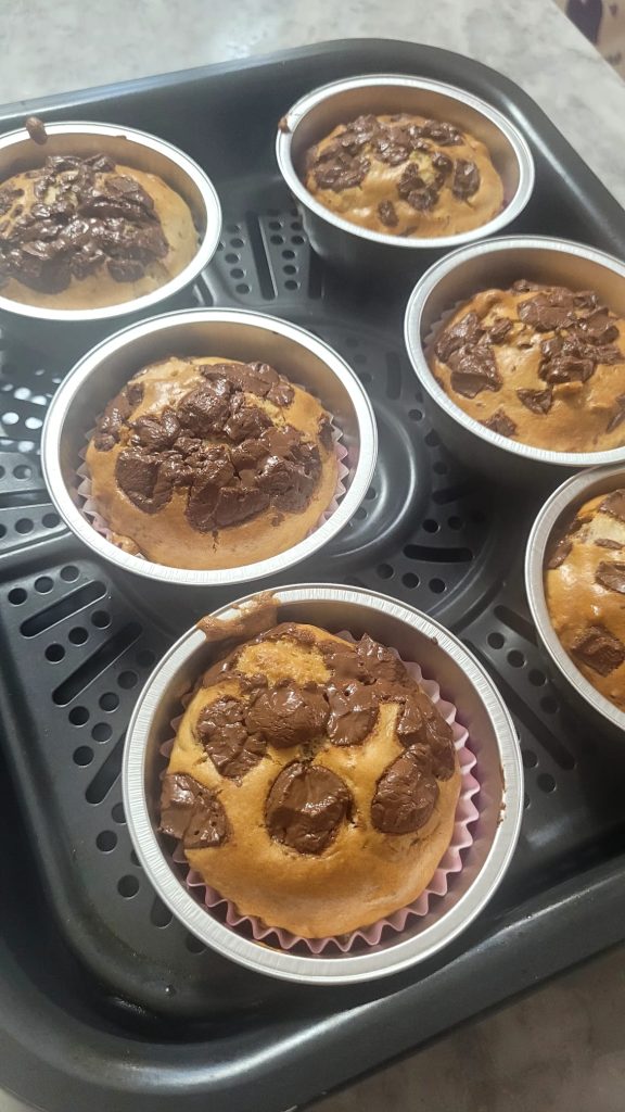 Voeg bovenop de chocoladeschilfers of druppels toe. Verwarm de airfryer voor op 170°C voor 2/3 minuten en na het voorverwarmen, plaats de vormpjes op het rek van de airfryer