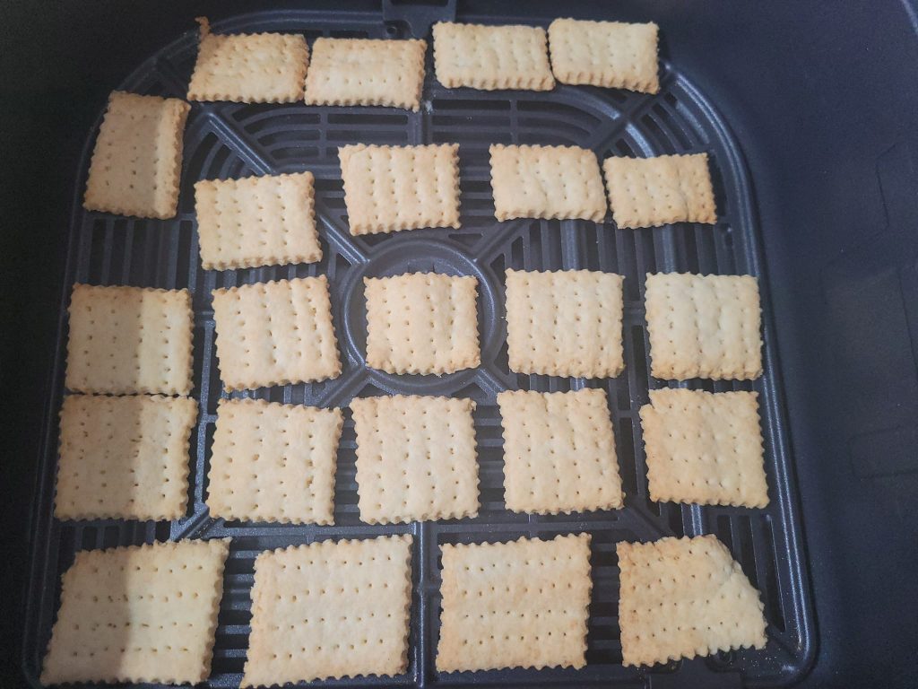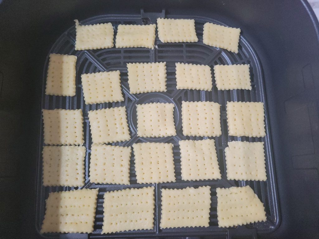 Leg de crackers op het rooster van de airfryer en bak op 180 °C gedurende 10 minuten