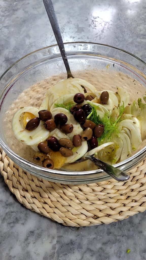 In dit recept gebruiken we twee sinaasappels: van één gebruiken we het sap, geëmulgeerd met extra vierge olijfolie en de geraspte schil om het gerecht af te maken en voor een extra frisheidstoets. Van de tweede sinaasappel gebruiken we de partjes die we bij de venkel voegen samen met wat Taggiasche olijven voor een meer uitgesproken smaak.