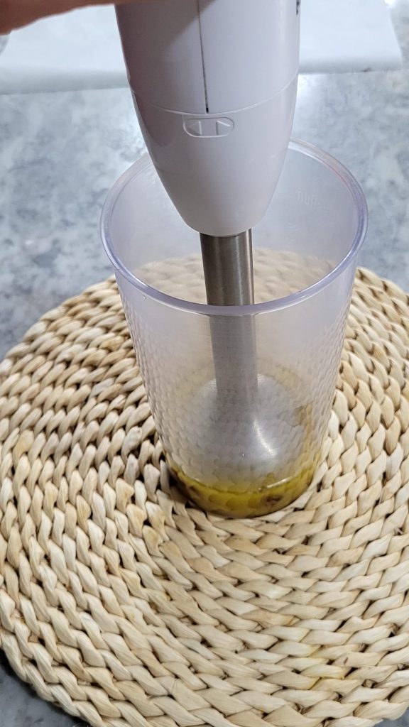 Bereid de emulsie: neem de beker van de staafmixer en voeg extra vierge olijfolie, het uitgeperste en gezeefde sinaasappelsap toe.