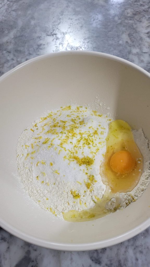 Giet in een grote kom de bloem, suiker, het snufje zout, het ei, de geraspte schil van de citroen, van de sinaasappel (als je geen pasta gebruikt) en roer met een lepel, zodat je een zanderig mengsel krijgt