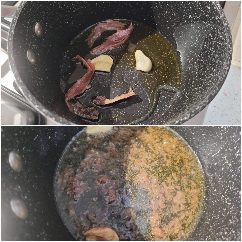 Laat in een pannetje op laag vuur de ansjovisfilets smelten met een teentje knoflook en een scheutje olijfolie