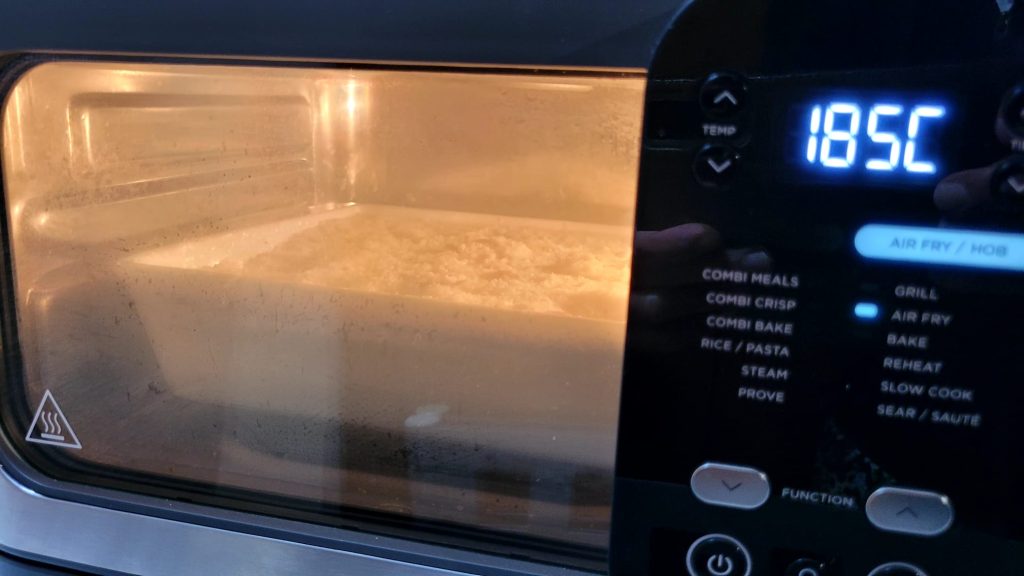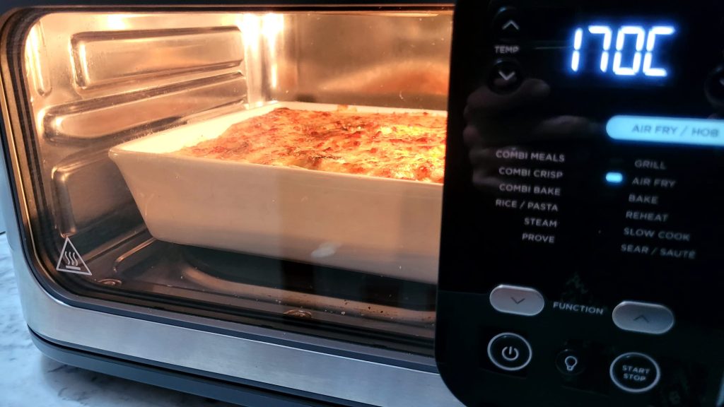 Als de bovenkant snel donker wordt, verlaag dan naar 170°C en ga verder voor 5 minuten of totdat er een goudbruine en knapperige korst op de bovenkant komt